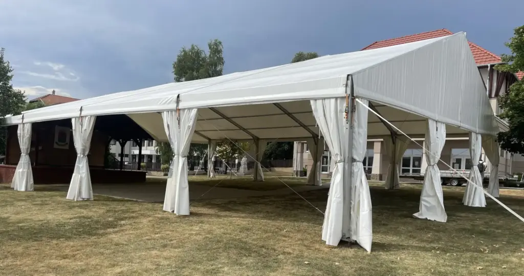 Ez a 15 méter széles, prémium kategóriás rendezvénysátor tökéletes választás, ha nagy létszámú, szabadtéri eseményhez keres időjárásálló és esztétikus fedett megoldást.