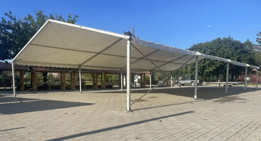 Általában 1–2 fő 10–15 perc alatt fel tudja állítani a pavilont, szerszám nélkül. Igény esetén segítünk az összeszerelésben.