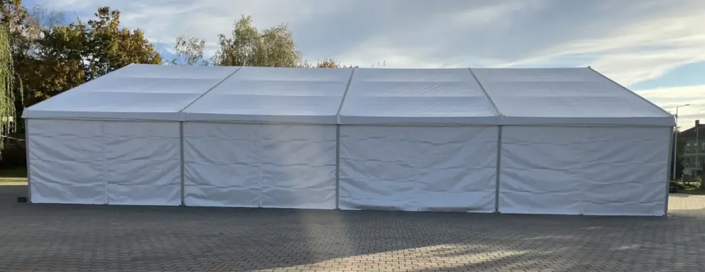 A sátor robusztus alumínium szerkezettel és DIN/M2 minősítésű ponyvával rendelkezik, így egyszerre nyújt biztonságot és eleganciát. Rugalmas kialakítása lehetővé teszi, hogy a kívánt hosszhoz igazítsuk – 5 méteres szakaszokban bővíthető.